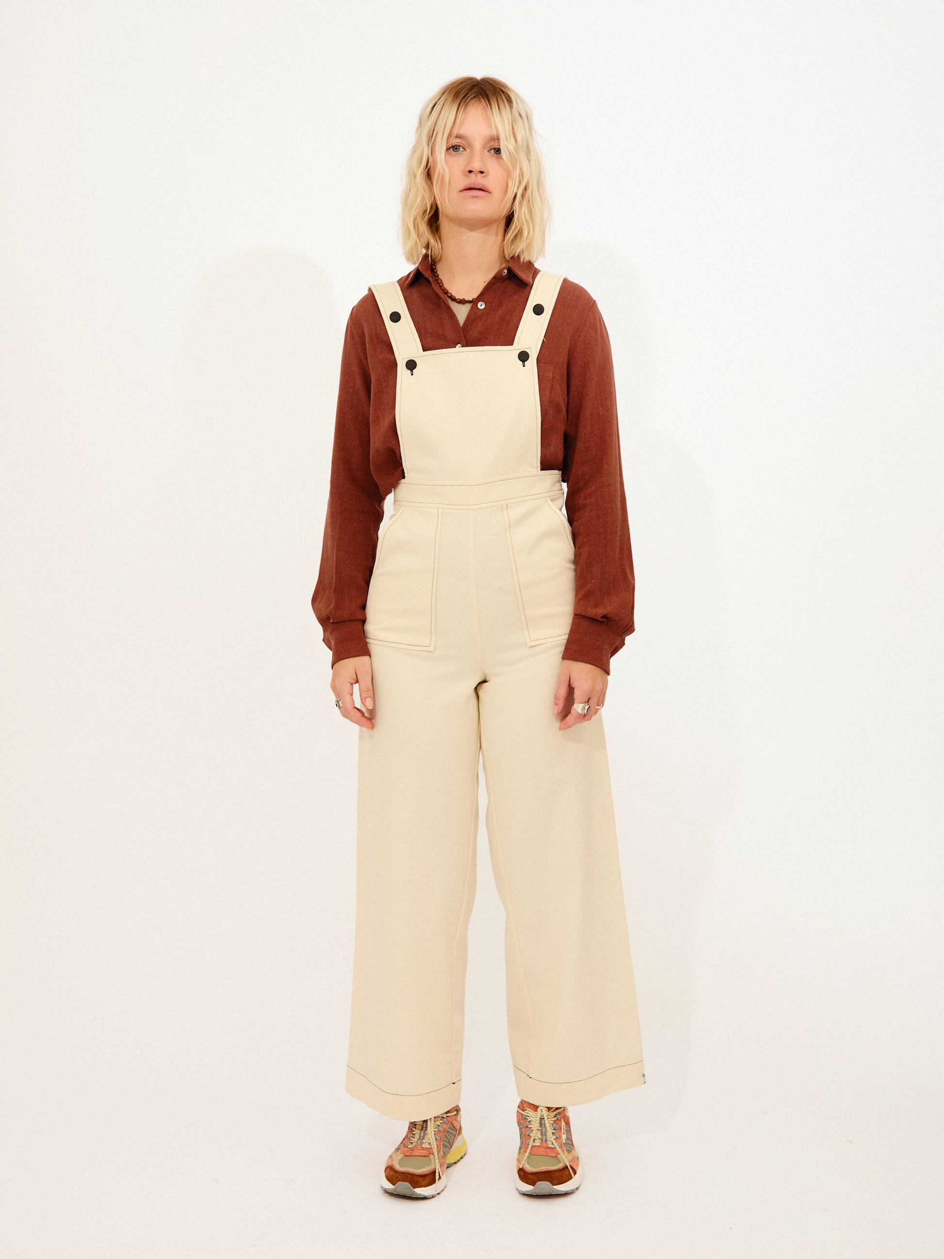 OBSERVACIONES: Peto pantalón de pernera ancha confeccionado en algodón orgánico, con tirantes regulables para adaptar el largo y el ajuste a tu cuerpo. Diseño limpio con pespuntes visibles que aportan carácter y bolsillos delanteros funcionales y un pequeño bolsillo en la espalda. Su patrón permite gran versatilidad tanto para cuerpos más rectos como con más curva de cintura a cadera.