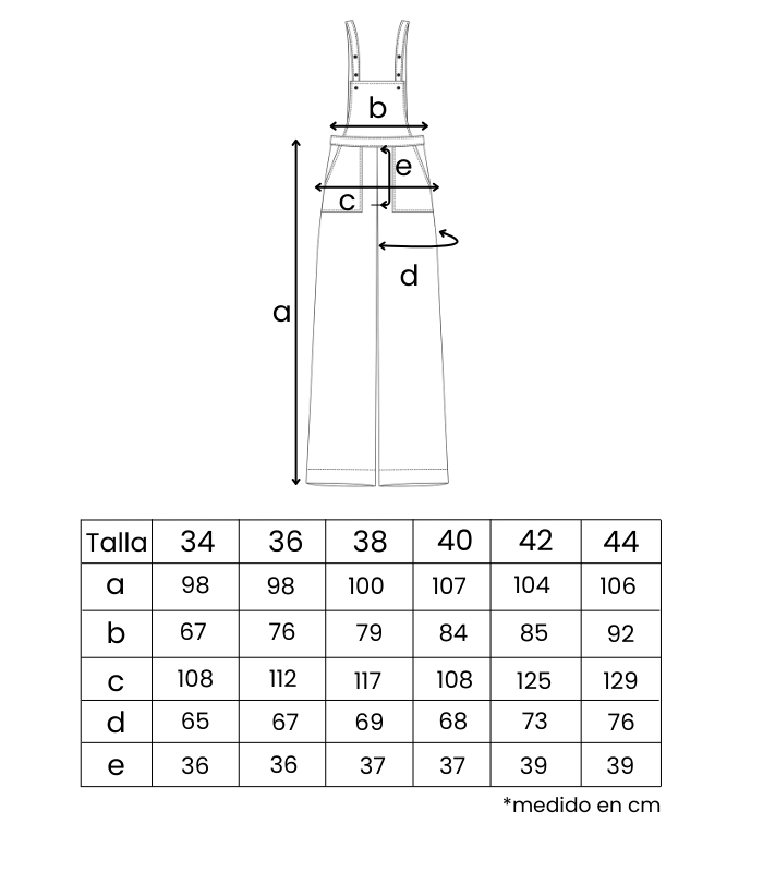 OBSERVACIONES: Peto pantalón de pernera ancha confeccionado en algodón orgánico, con tirantes regulables para adaptar el largo y el ajuste a tu cuerpo. Diseño limpio con bolsillos delanteros funcionales y un pequeño bolsillo en la espalda. Su patrón permite gran versatilidad tanto para cuerpos más rectos como con más curva de cintura a cadera.