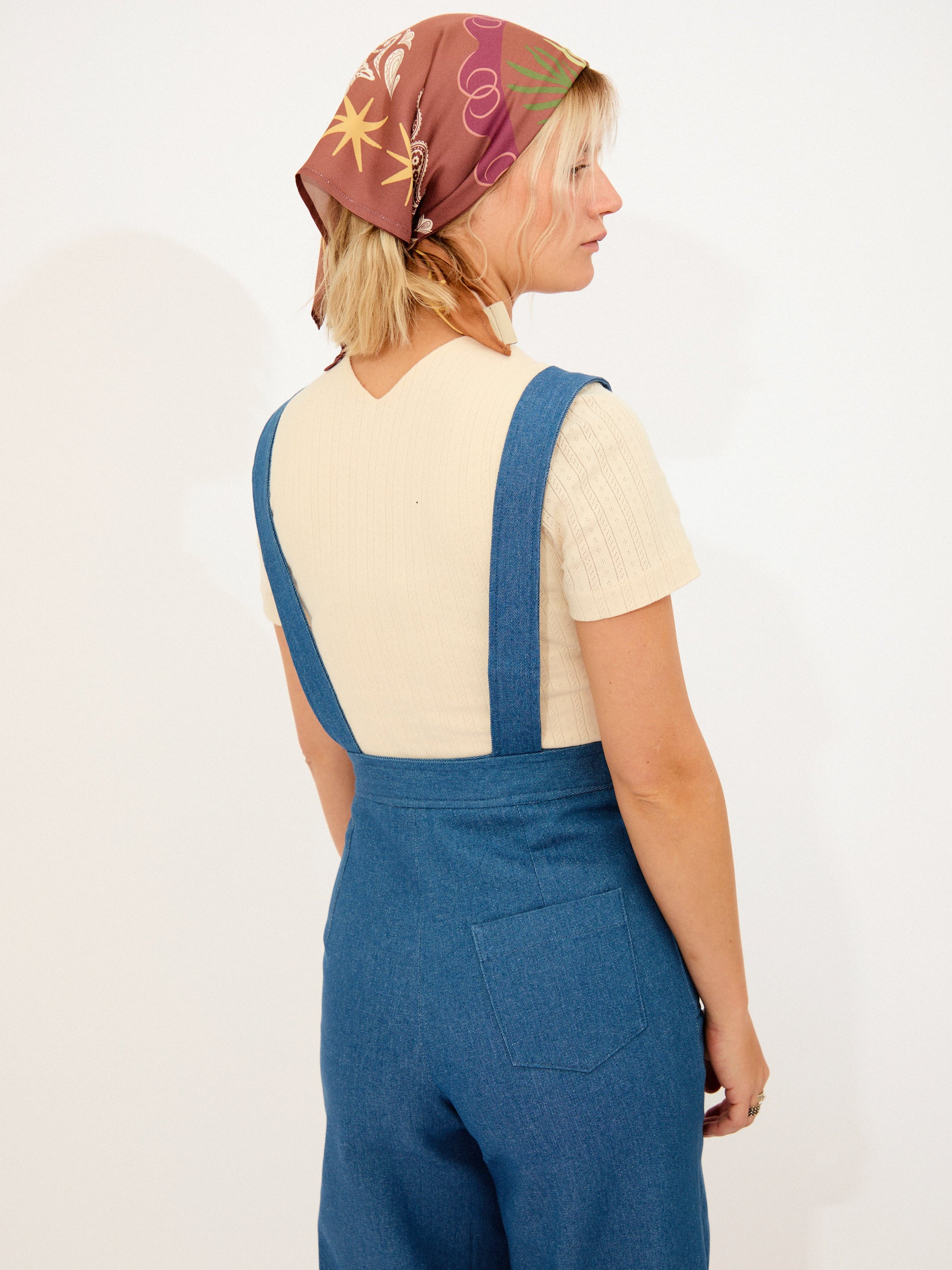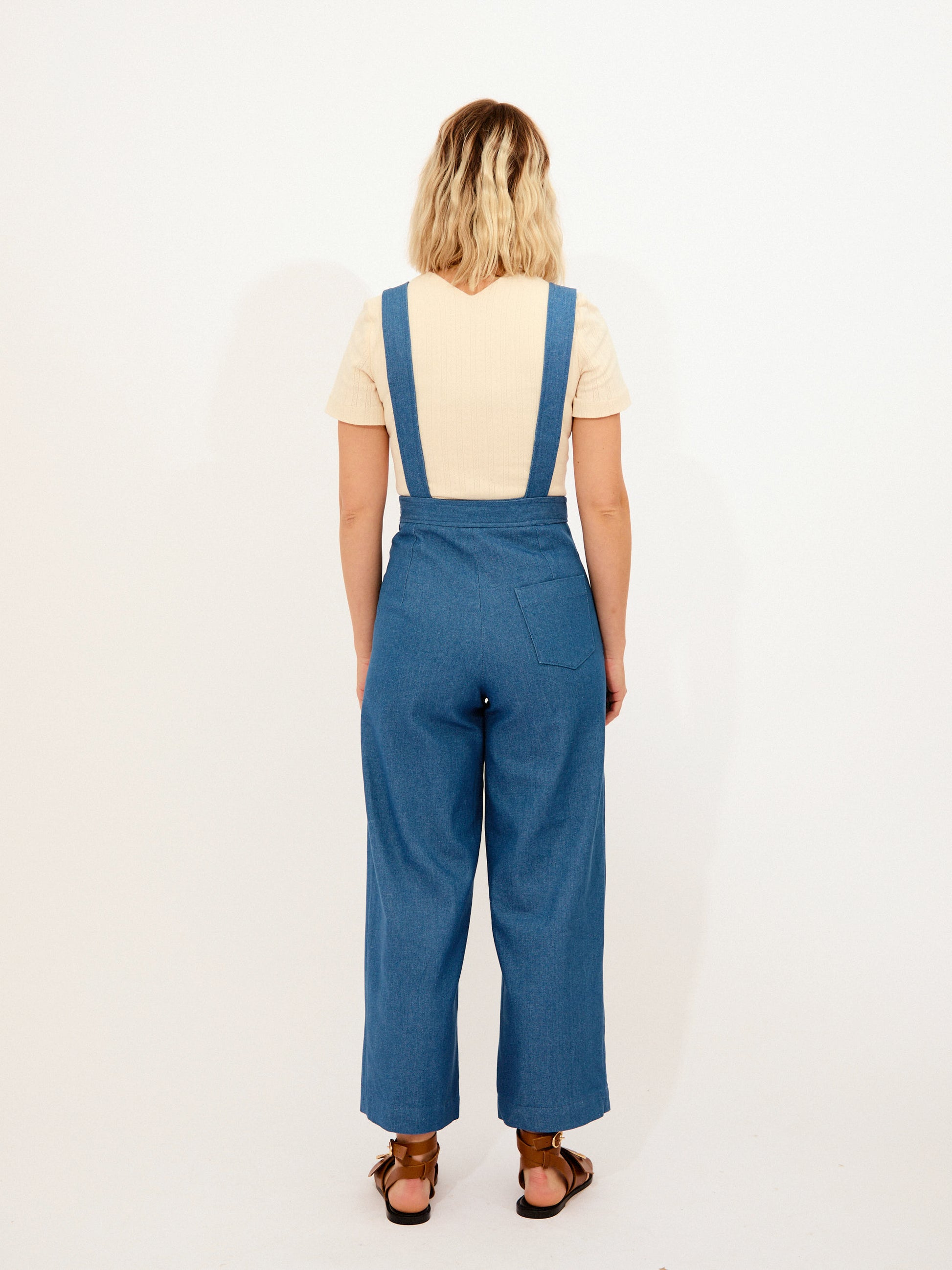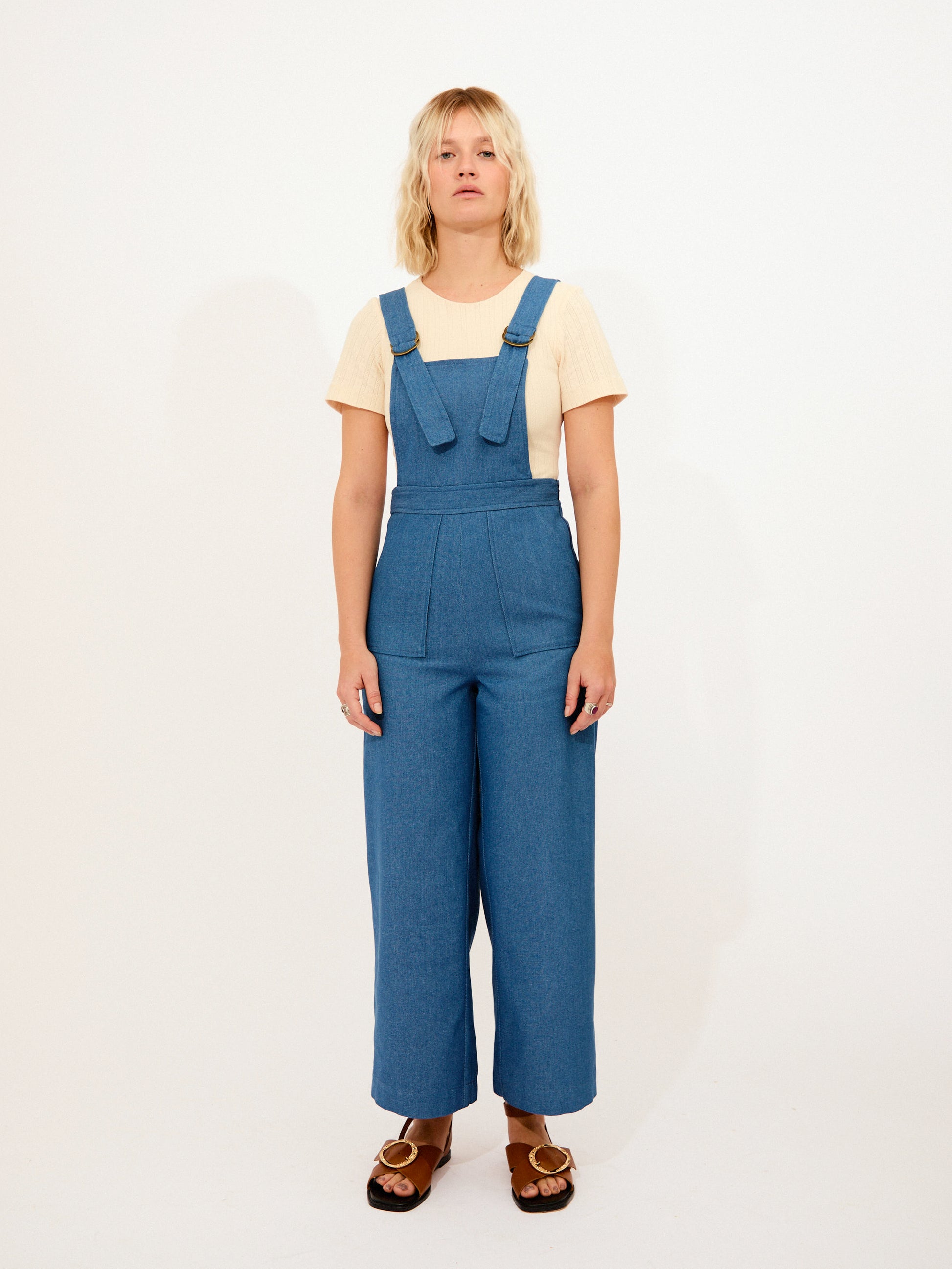 OBSERVACIONES: Peto pantalón de pernera ancha confeccionado en algodón orgánico, con tirantes regulables para adaptar el largo y el ajuste a tu cuerpo. Diseño limpio con bolsillos delanteros funcionales y un pequeño bolsillo en la espalda. Su patrón permite gran versatilidad tanto para cuerpos más rectos como con más curva de cintura a cadera.