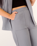 Pantalón con pernera ancha. Pespuntes y cremallera lateral.