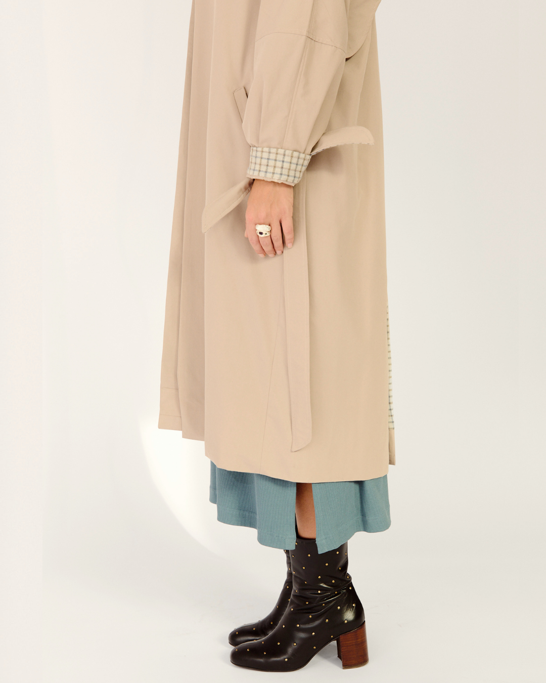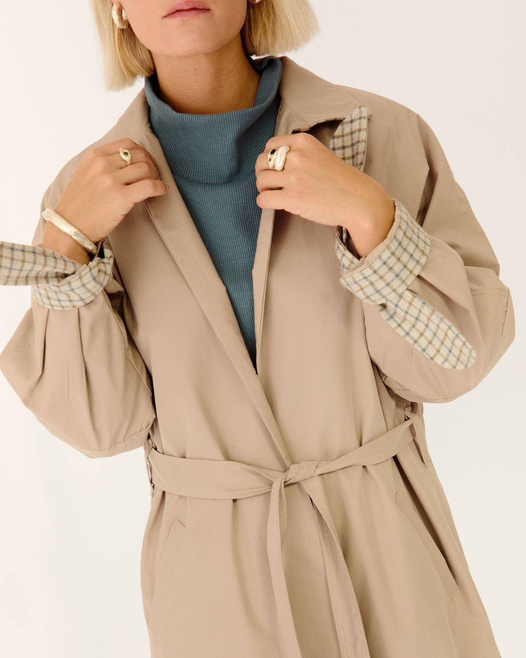 Gabardina Lía: La joya de la colección, un fondo de armario especial e ideal. La gabardina Lía, cuenta con un canesú forrado del estampado QUIET con un cinturón incorporado para ajustarla a tu gusto. Los puños y el cuello de la gabardina también están forrados del estampado QUIET. Además, el tejido exterior es impermeable.