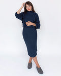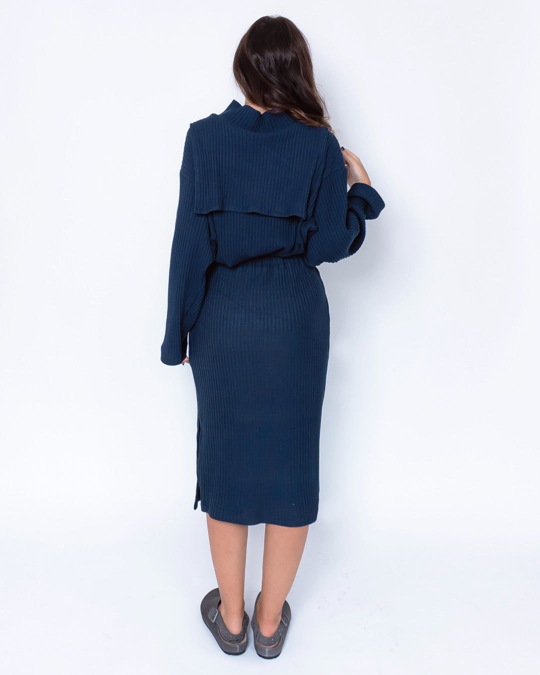 Con cuello alto elegante, detalle de pieza frontal y trasera, corte midi y holgado que estiliza y un punto canalé atemporal, está pensado para acompañarte en mil planes (desde la oficina hasta una cena improvisada).