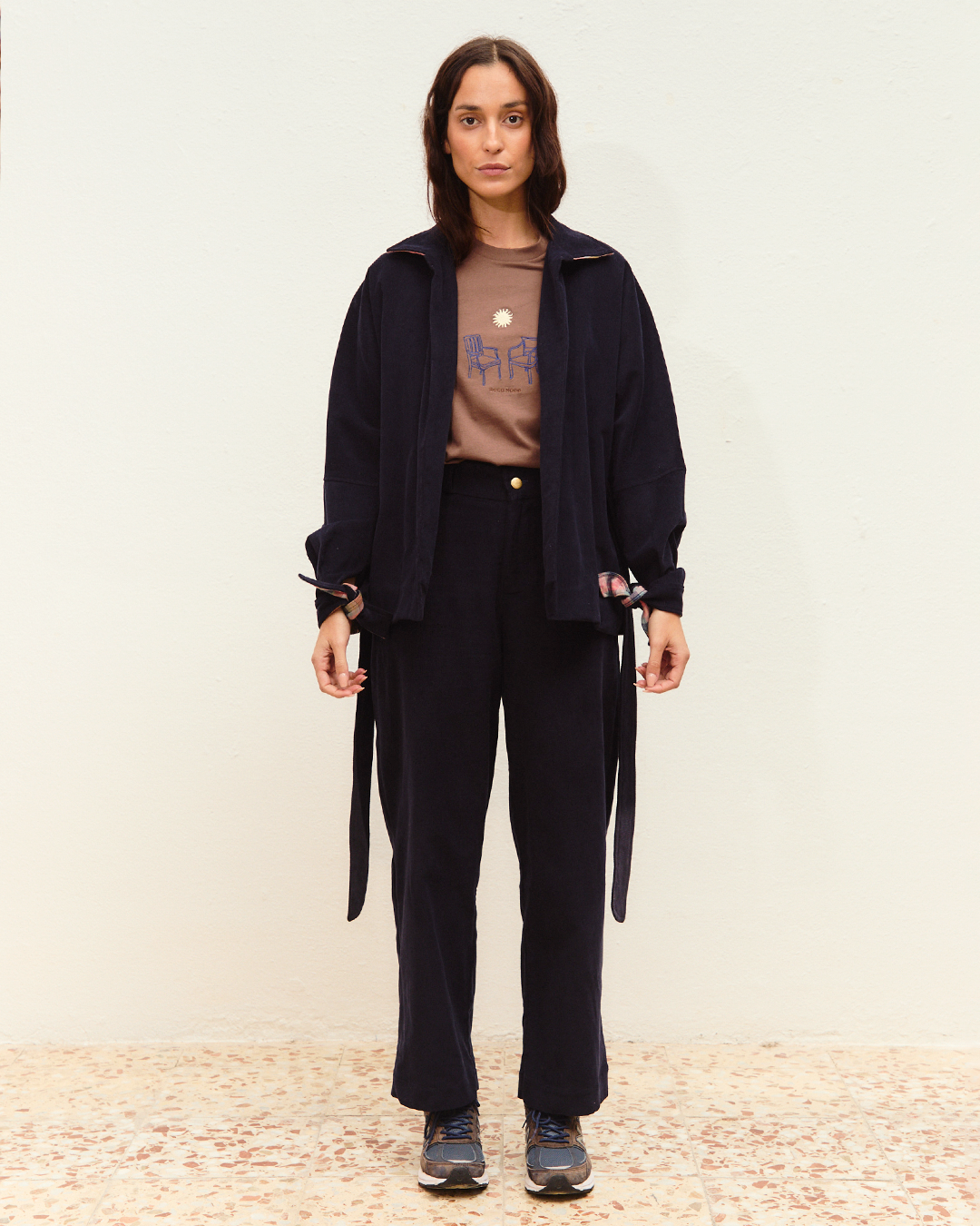 Esta prenda ha sido cortada en Belmonte del Tajo (Madrid) y confeccionada con mimo en Madrid, en talleres familiares que cuidan de cada detalle.