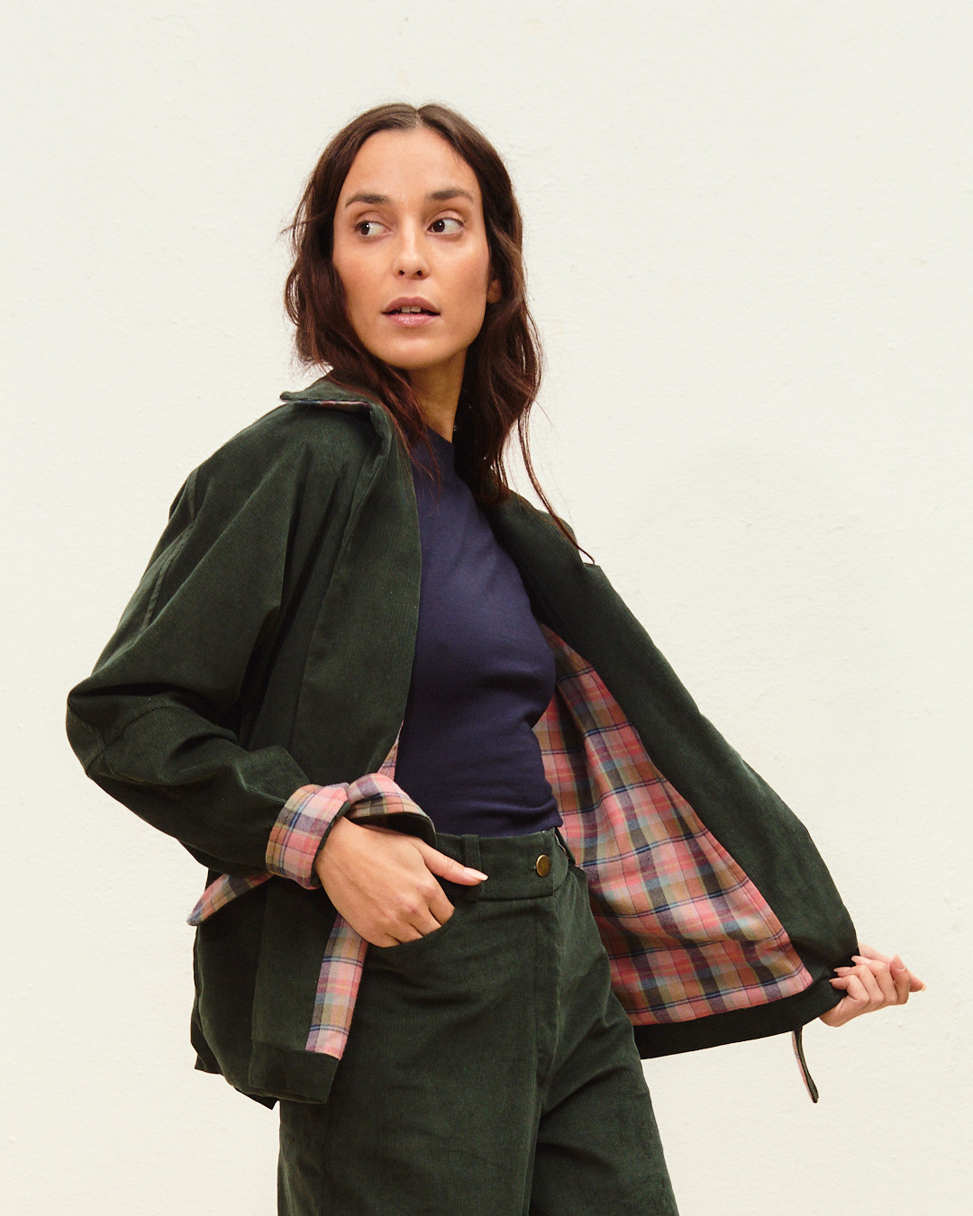 pantalón noa pana verde botella + chaqueta lía pana verde botella