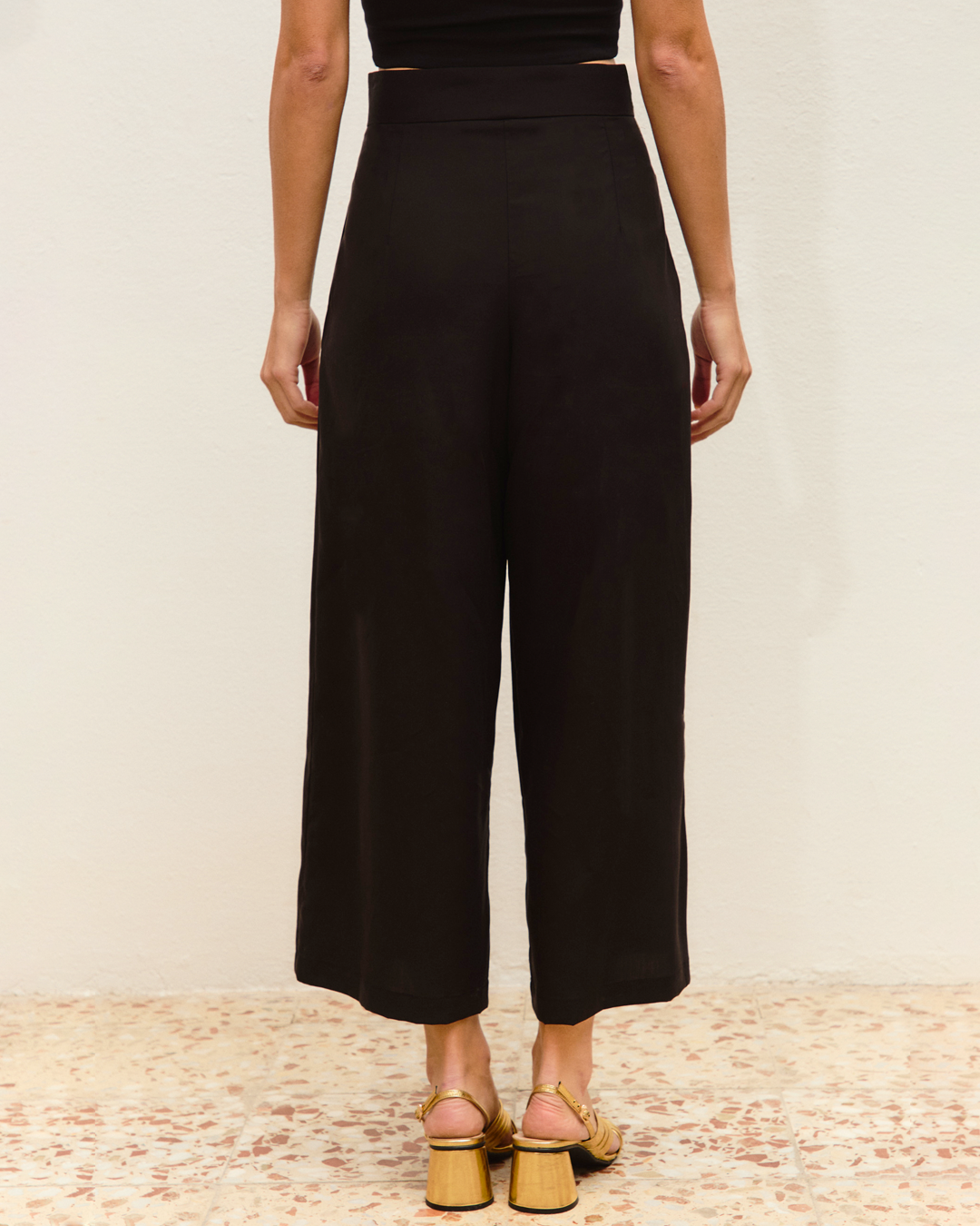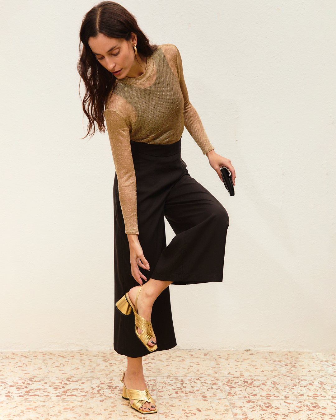 Pantalón midi, de pata ancha. Tiro muy alto. Bolsillos laterales. Cinturilla de 5cm.